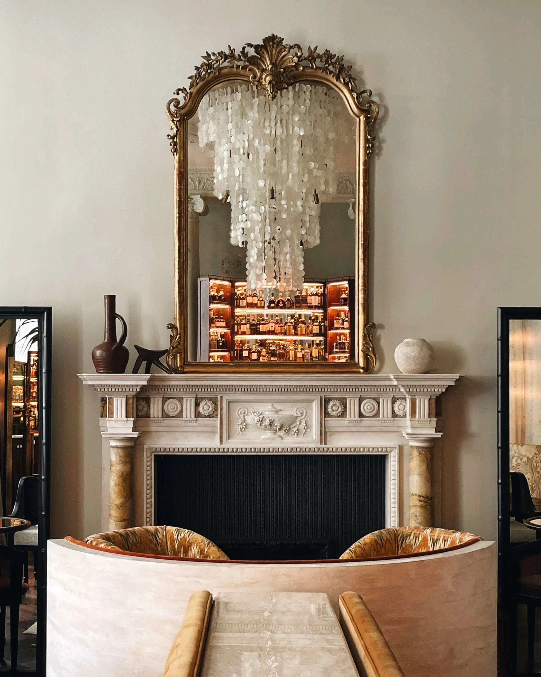 A low-key nod to the East Coast, the room features a giant capiz shell chandelier, mirrored cocktail bar and sumptuous banquettes that add retro touches to the room, blending period fidelity and contemporary gloss.